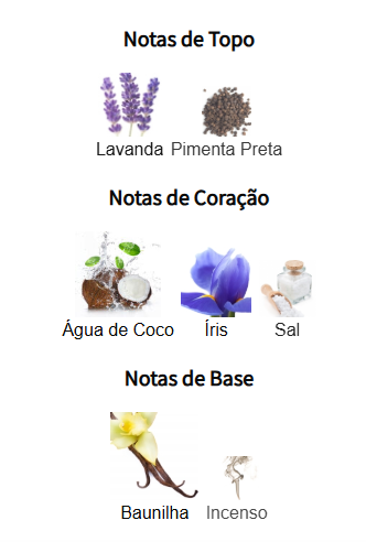 Desde as primeiras notas, ele se abre com uma combinação elegante e moderna de lavanda aromática e pimenta-preta vibrante, revelando uma faceta fresca e intensa ao mesmo tempo. No coração, surge um contraste fascinante entre a cremosidade da água de coco, o toque mineral do sal e a sofisticação da íris, que adiciona textura e luxo à composição. A base é um convite ao vício olfativo: baunilha aveludada e incenso delicadamente defumado, criando um rastro quente, sensual e viciante.