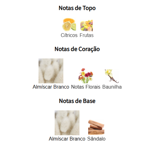 A abertura traz um frescor luminoso com cítricos suaves e um toque floral etéreo, criando uma sensação imediata de pureza. Logo, a fragrância evolui para um coração cremoso onde o almíscar branco domina de forma elegante, acompanhado por nuances florais aveludadas que tornam o perfume ainda mais encantador.